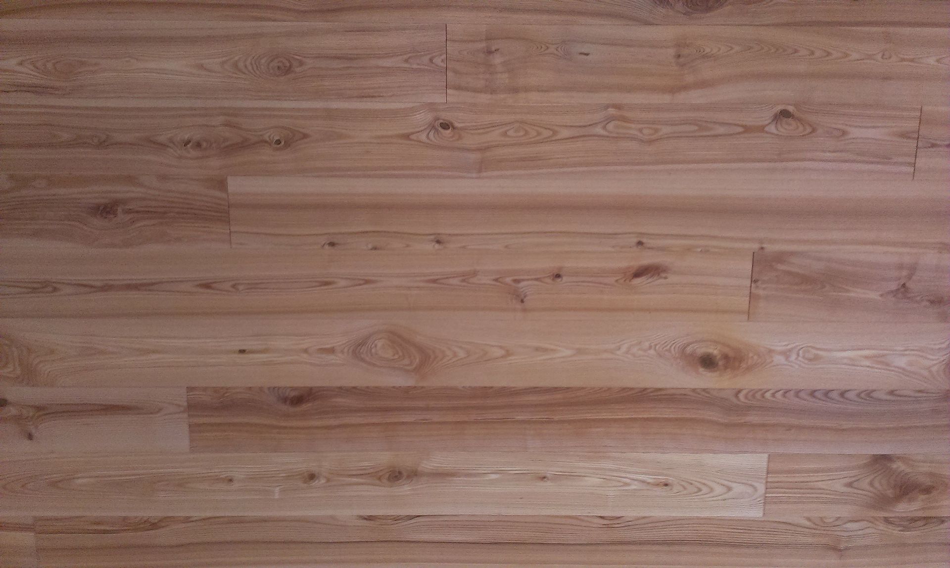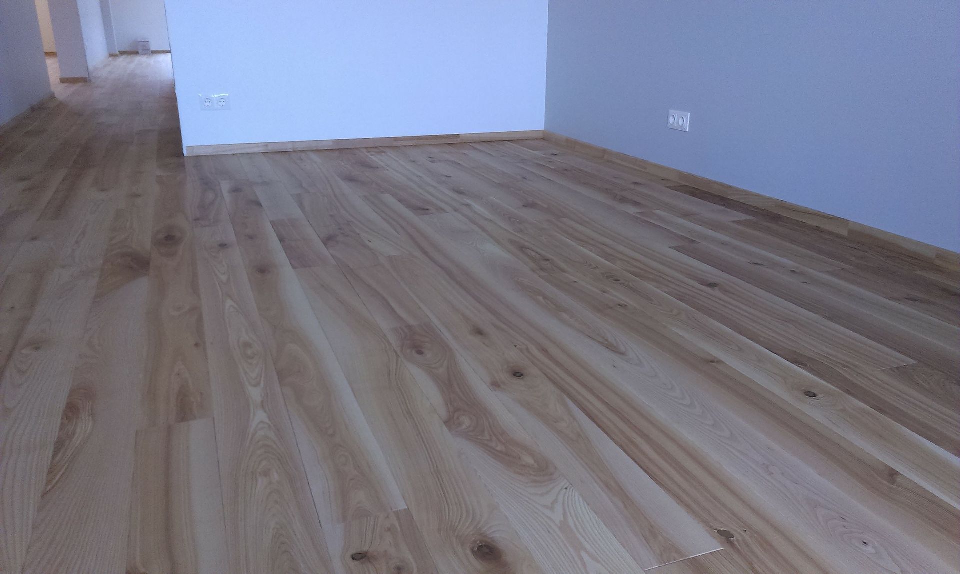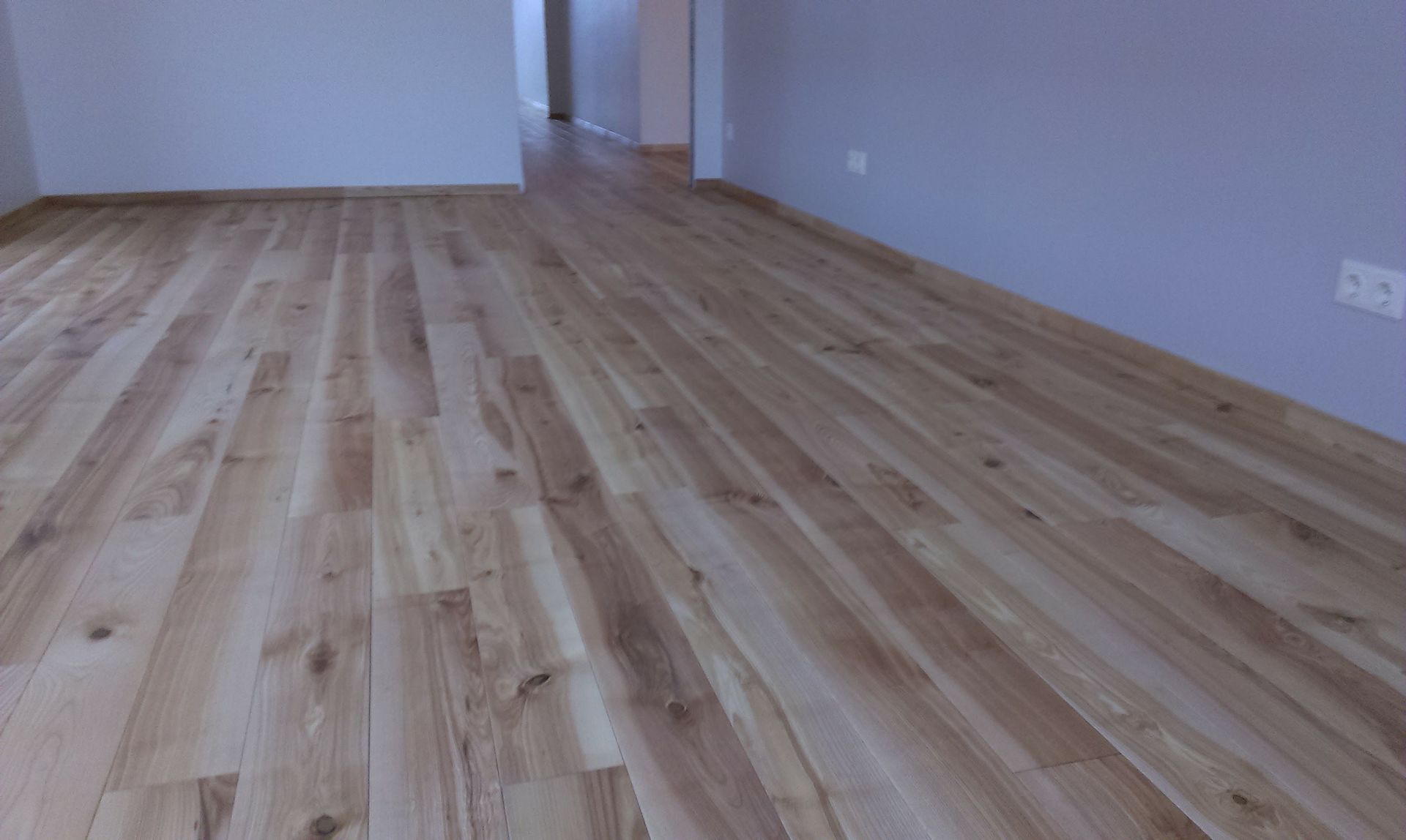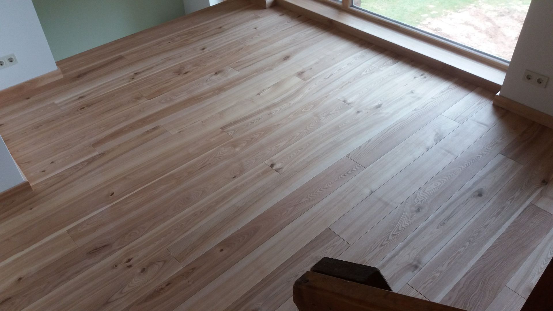 Oša grīdas dēļi bez zariem, ar nelielām dabīgām krāsu variācijām, kodola un aplievas koksne.