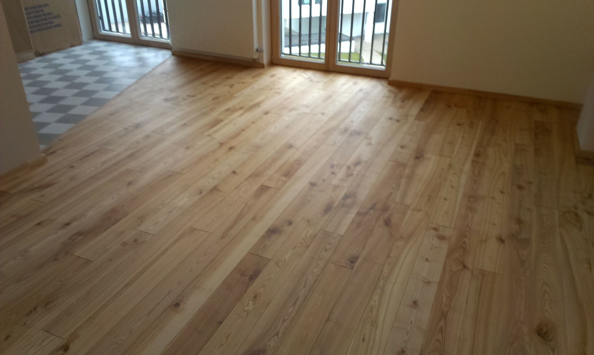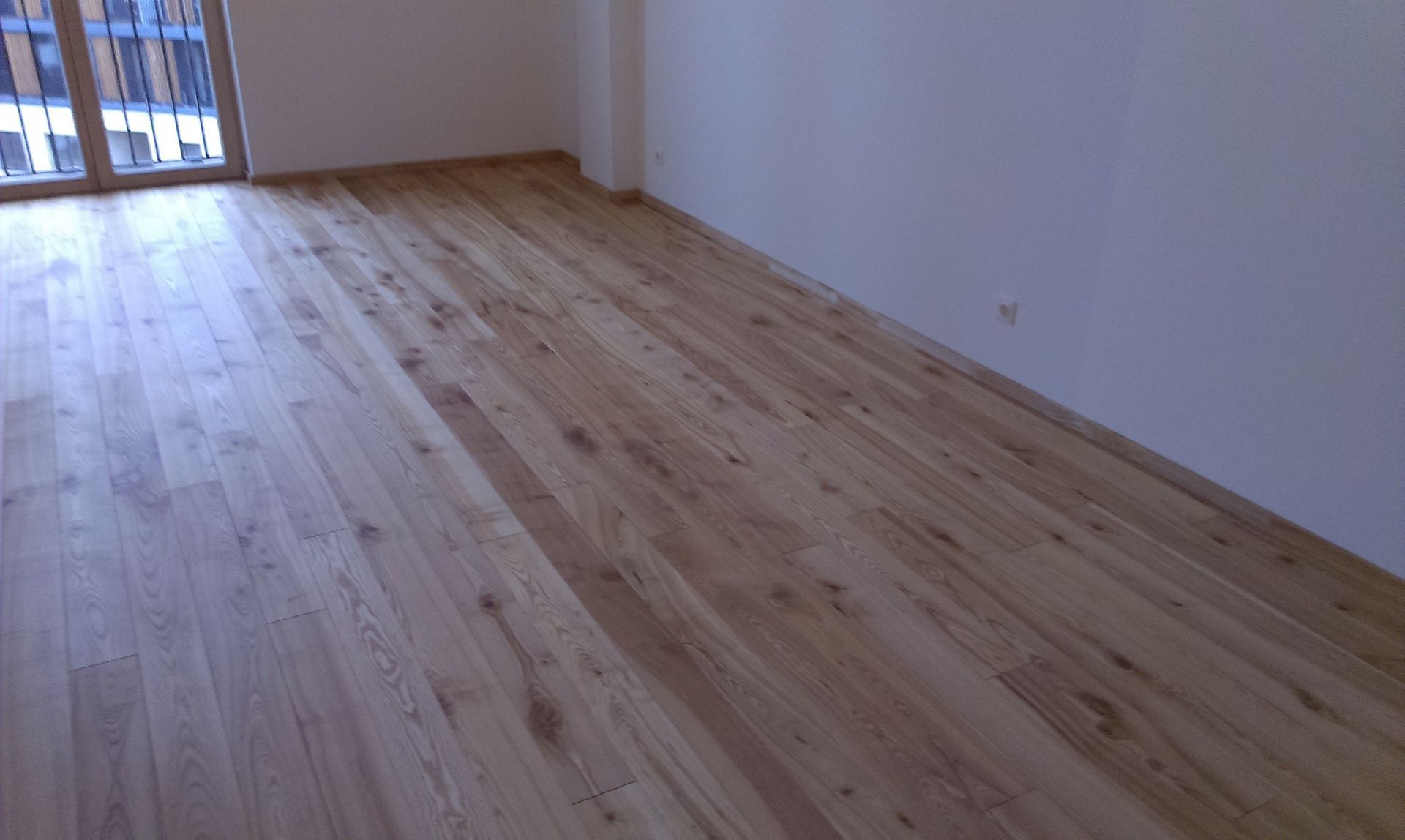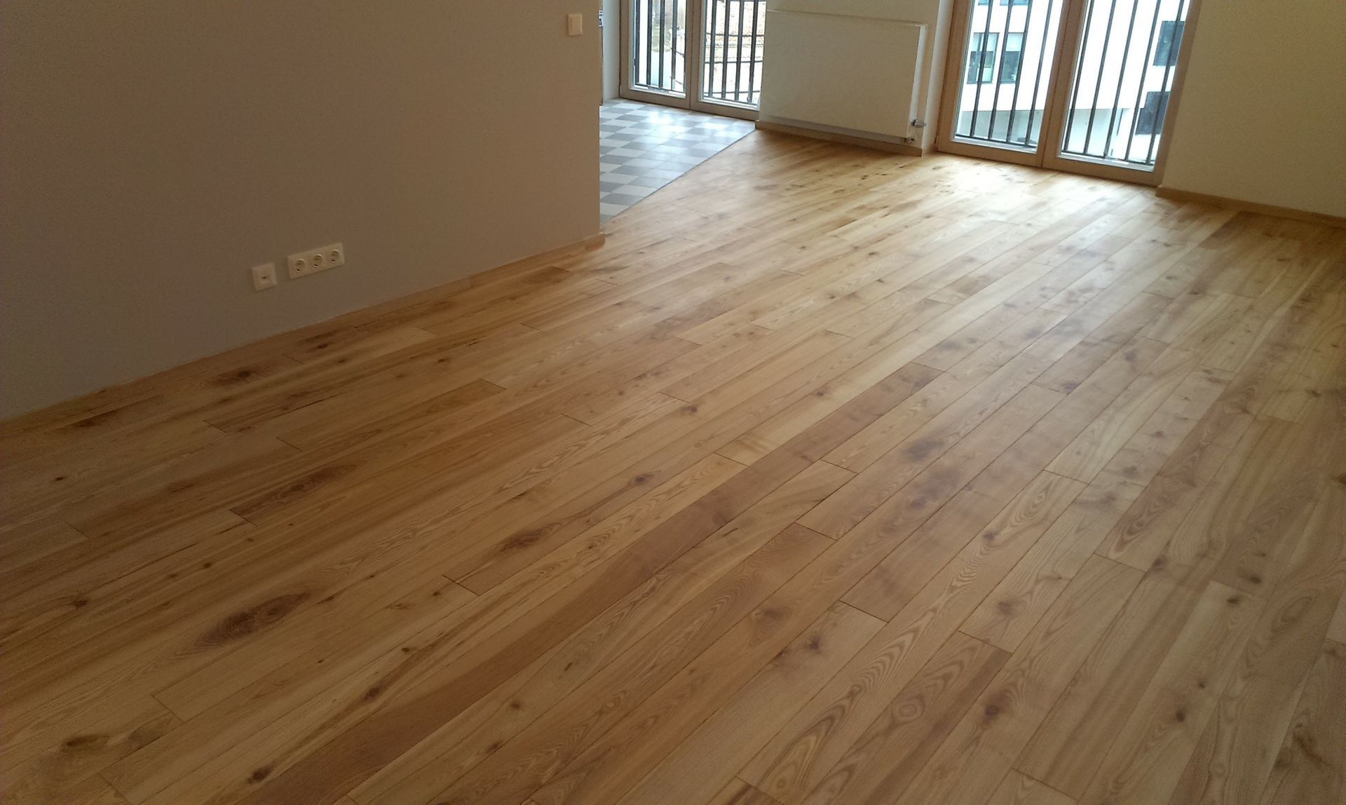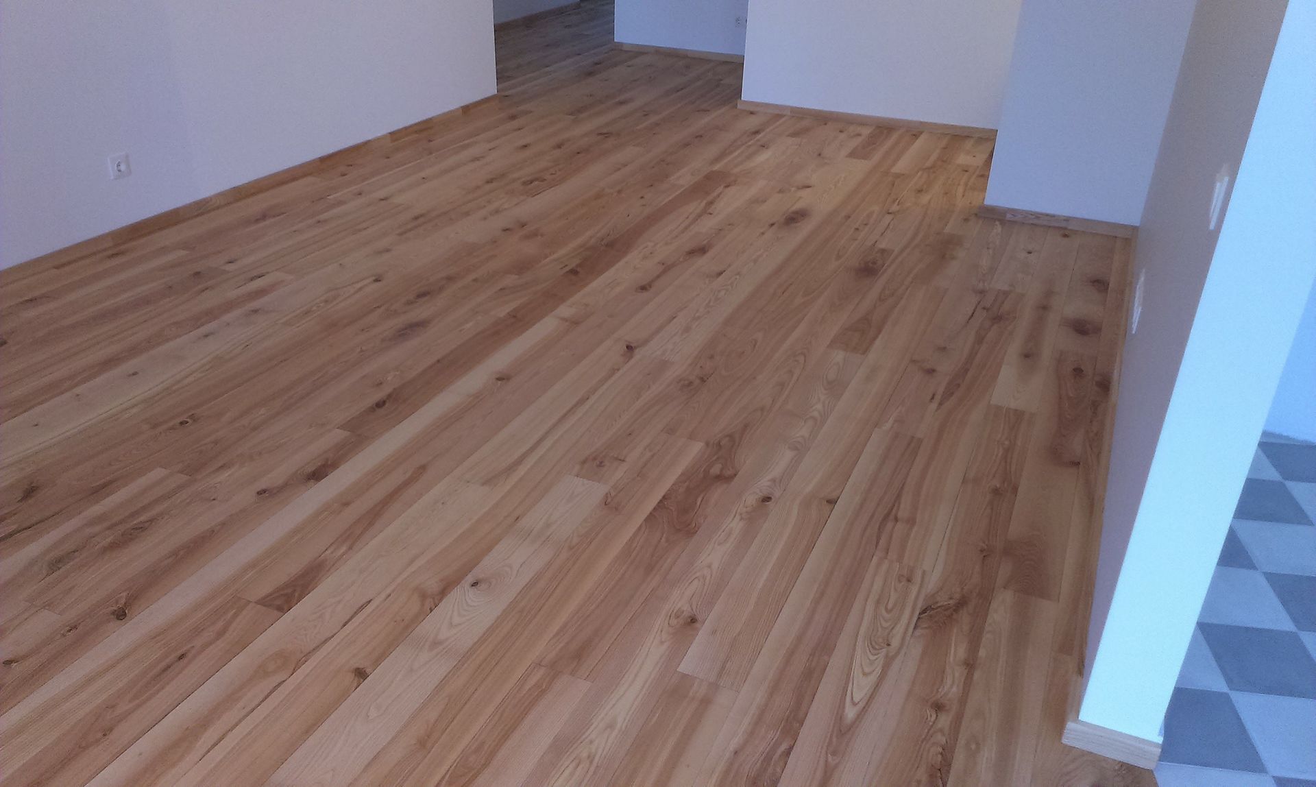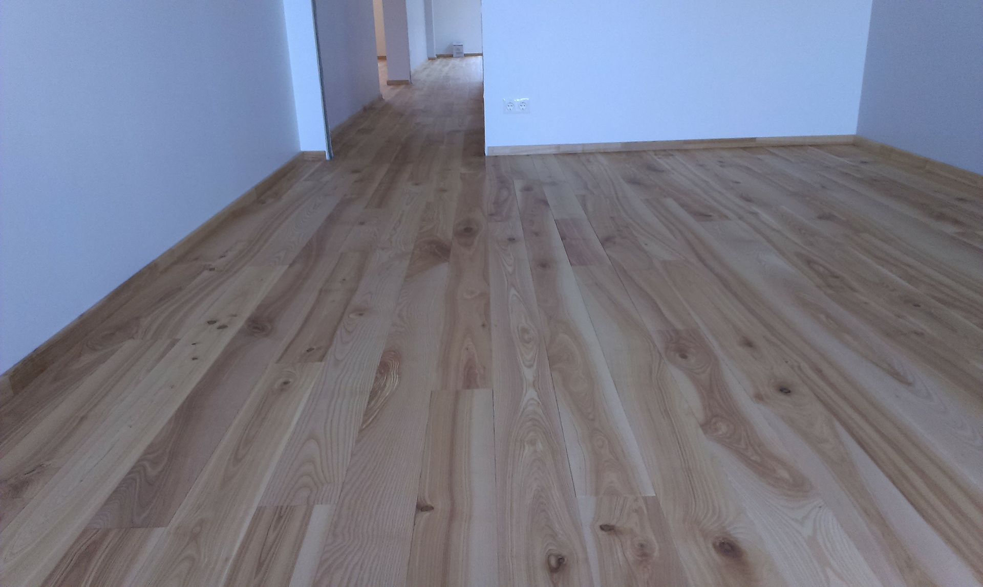 Oša grīdas dēļi bez zariem, ar nelielām dabīgām krāsu variācijām, kodola un aplievas koksne.